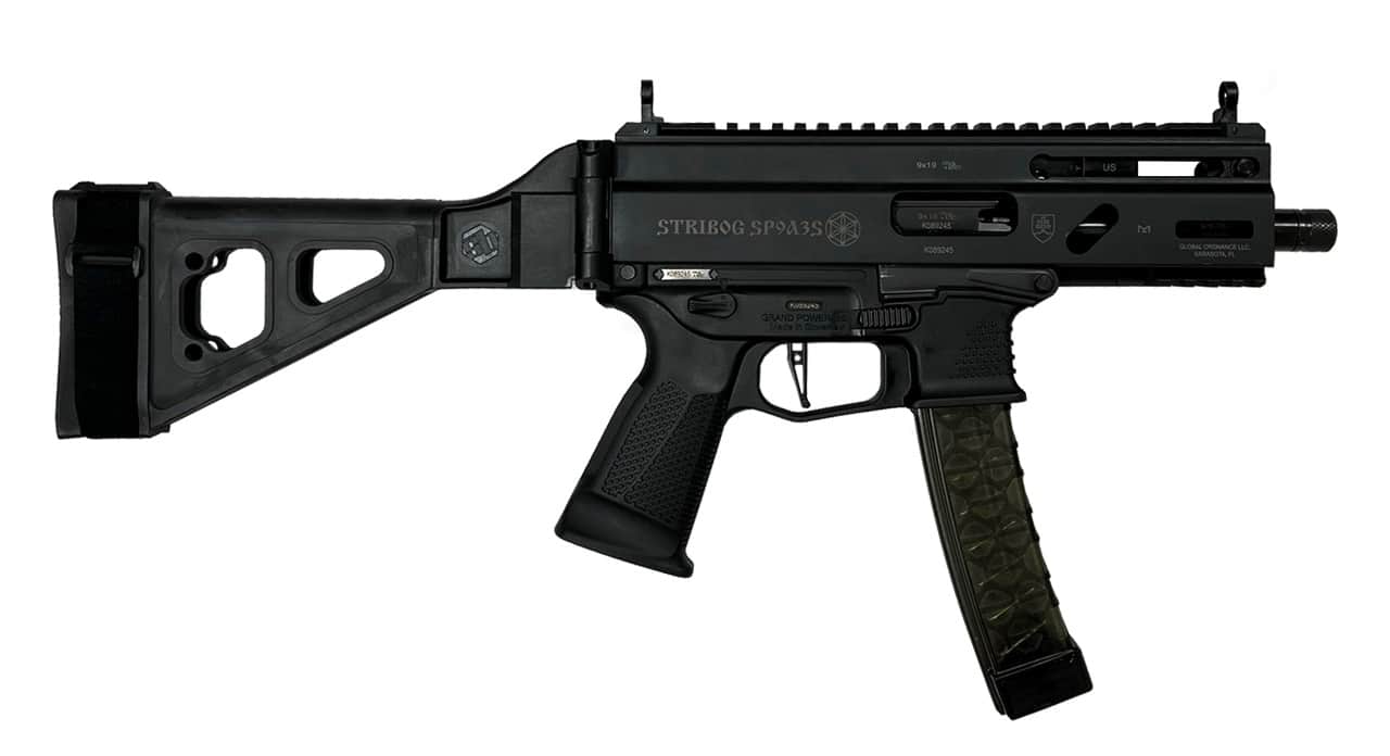 Grand Power Stribog SP9A3S Pistol – Black | 9mm | 5″ Threaded Barrel | 30rd | Folding SBT Brace
