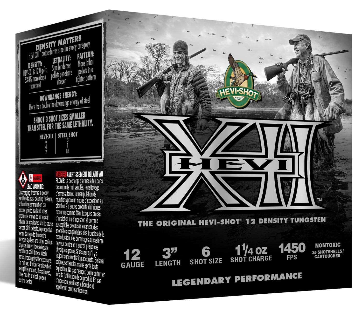 HEVI-XII is 53.8% more dense than steel, which translates to double the downrange energy. This allows you to drop down 3 shot sizes for the same lethality. It also gives you 28% more devastating pellets on target. More kills. Fewer Cripples. Better Stories. Pack in with HEVI-XII and walk out carrying extra weight.