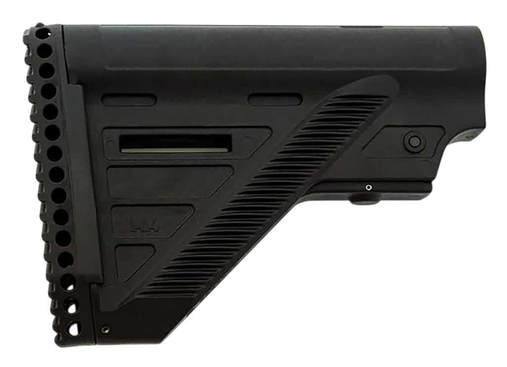 New from HK Germany the slim line retractable stock fits all commercial & mil-spec AR-15/M16 buffer tubes. Marked with the HK logo and issued on specialized HK 416, MR556 rifles.