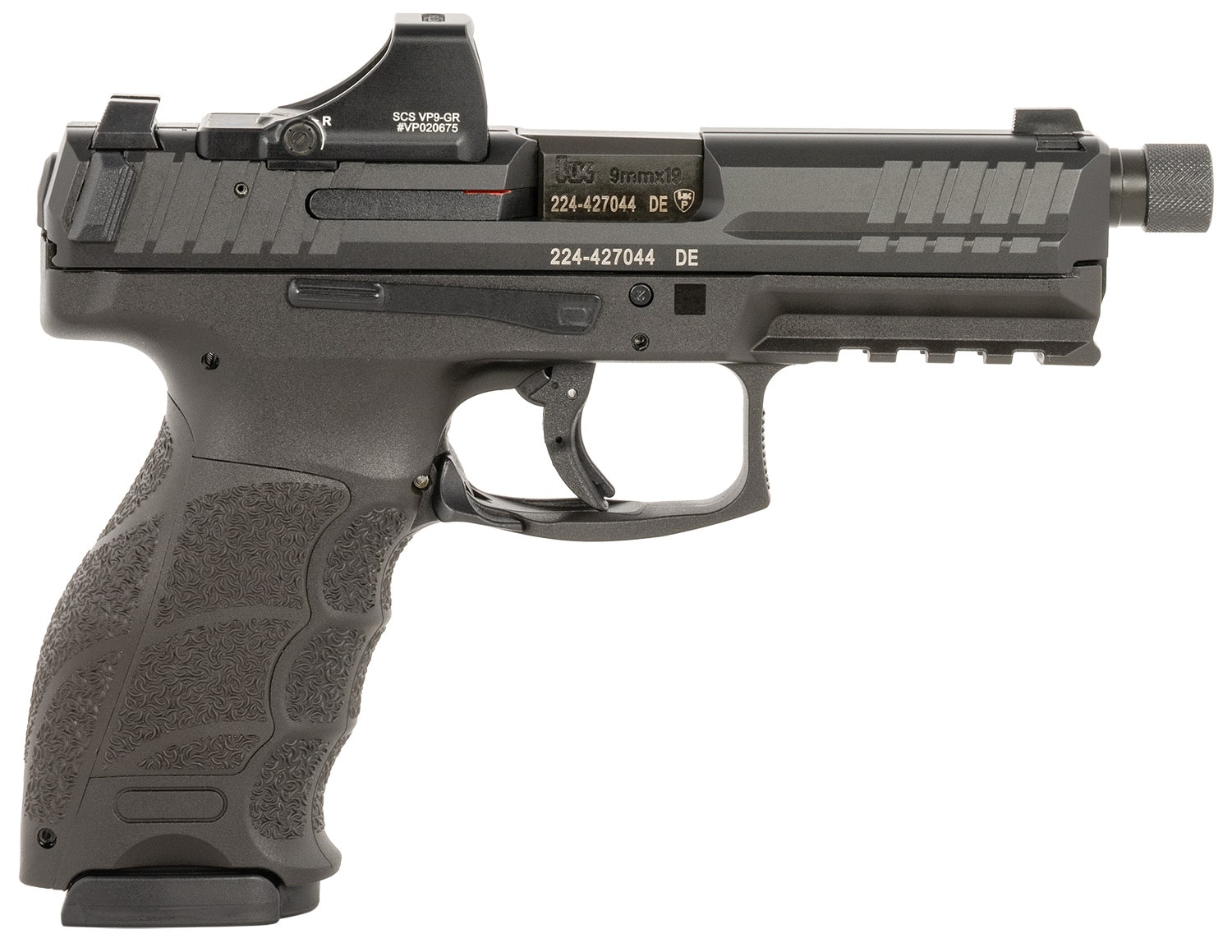 The VP9 Tactical OR features machined optics cut slide accommodates popular red dots; grip with interchangeable backstraps; sights provide a lower 1/3 Co-Witness through the window of a red dot sight while remaining visible over the top of most suppressors; Rear sight with serrations gives a cleaner, black sight. High-contrast color tritium front sight for fast day or night acquisition. Includes two magazines and a Holosun SCS Super Green.