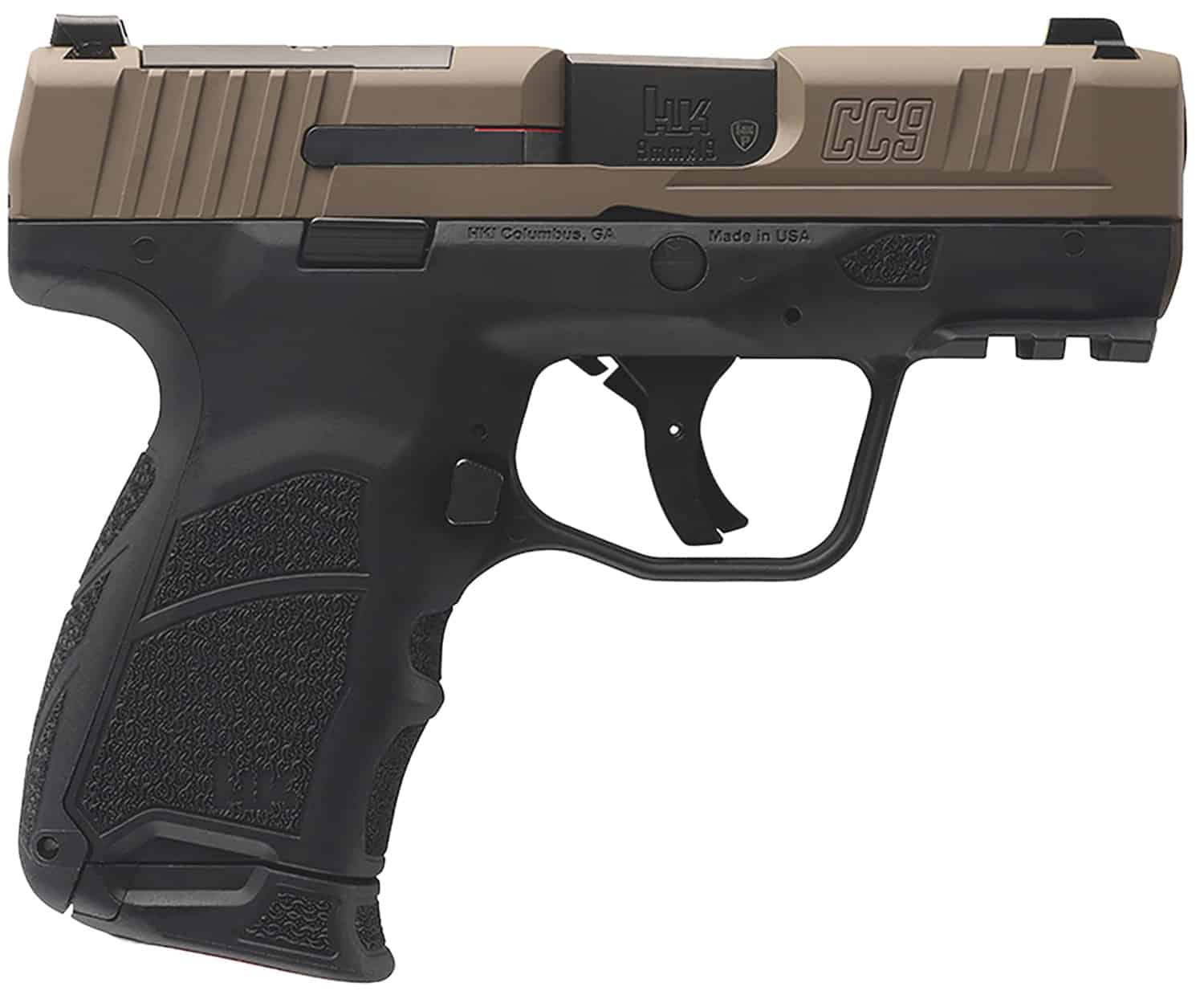 The CC9 is HKs smallest double-stack handgun. Its small features mirrored ambidextrous controls; picatinny-style rail; optics-ready slide; 5lb trigger has a crisp wall and reset; factory included night-sight and a grip with two interchangeable backstraps. Includes 10rd and 12rd magazine.
