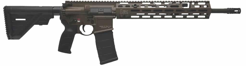 HK 81001204 MR556 A4 5.56x45mm 10+1 16.50″ Black Threaded Barrel, Patriot Brown Picatinny Rail Receiver, M-LOK Handguard, 6 Position Black Synthetic Stock, Ambidextrous