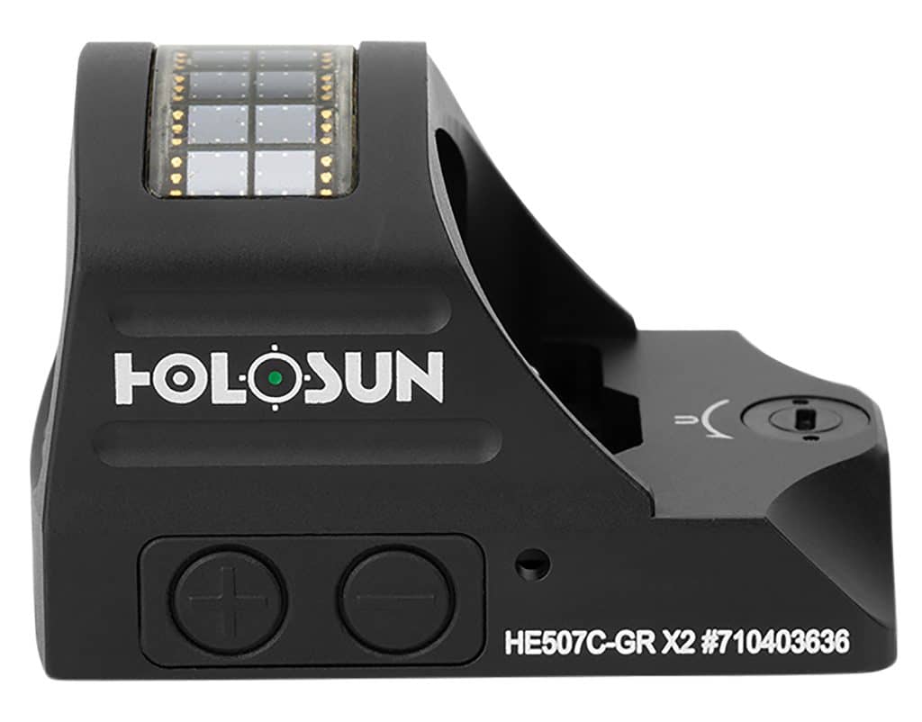The HE507C-GR X2 is an open reflex optical sight designed full-sized for pistol applications. The HE507C-GR X2 improves on previous versions by adding Lock Mode which was first introduced in our 2018 LEM pistol optic models. Lock Mode, when activated, locks the buttons preventing inadvertent setting changes. Additional features include Holosuns Green Super LED with up to 50k hour battery life, Solar Failsafe, Multi-Reticle System, and Shake Awake. The durable housing is made from 7075 Aluminum, uses an industry standard footprint, and houses the 1632 battery in a side-mounted tray for easy replacement when needed.