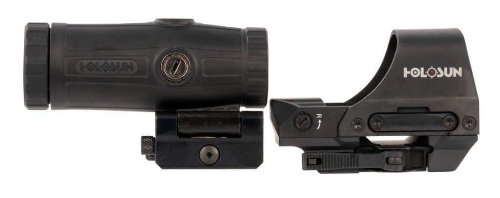 Holosun has earned a reputation for innovation when it comes to tactical sights and the HS510C and HM3X Magnifier Combo is the perfect red dot sight combination. The HS510C Open Reflex red dot sight offers a wide viewing window with advanced technology; Solar Failsafe technology powers the unit by a solar panel, which allows the sight is always charging an internal power storage cell, but it also utilizes a separate backup battery for triple power redundancy; Shake Awake technology puts the sight to sleep when no movement is detected but allows the optic to quickly jump into action at the slightest movement and the Multiple Reticle System (MRS) offers flexibility in visual perspectives. The reticle is interchangeable between a Red 65 MOA ring with 2 MOA dot, a ring only and a dot only depending on situational needs. A single LED projects all three reticles, so no re-zeroing is ever required. Though the HS510C mounts at an absolute co-witness as a default, this combo pack includes a bonus spacer so the HS510C can be mounted at a lower 1/3 co-witness if desired. The HM3X flip-to-the-side magnifier features a very generous 2.75″ of eye relief, extremely clear glass and an adjustable diopter for focus control. With a simple flip of the wrist, the operator can transition from no magnification to 3x power and back again. Mounting options include an integrated QD mount with an optional spacer for absolute co-witness and lower 1/3 co-witness. HS510C Surface Finish MAO. HM3X surface finish Anodize.