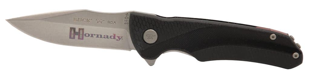Laser engraved Hornady logo. Black glass-filled nylon handle. Tumbled. 420HC Stainless Steel, drop point blade. Deep pocket clip.
