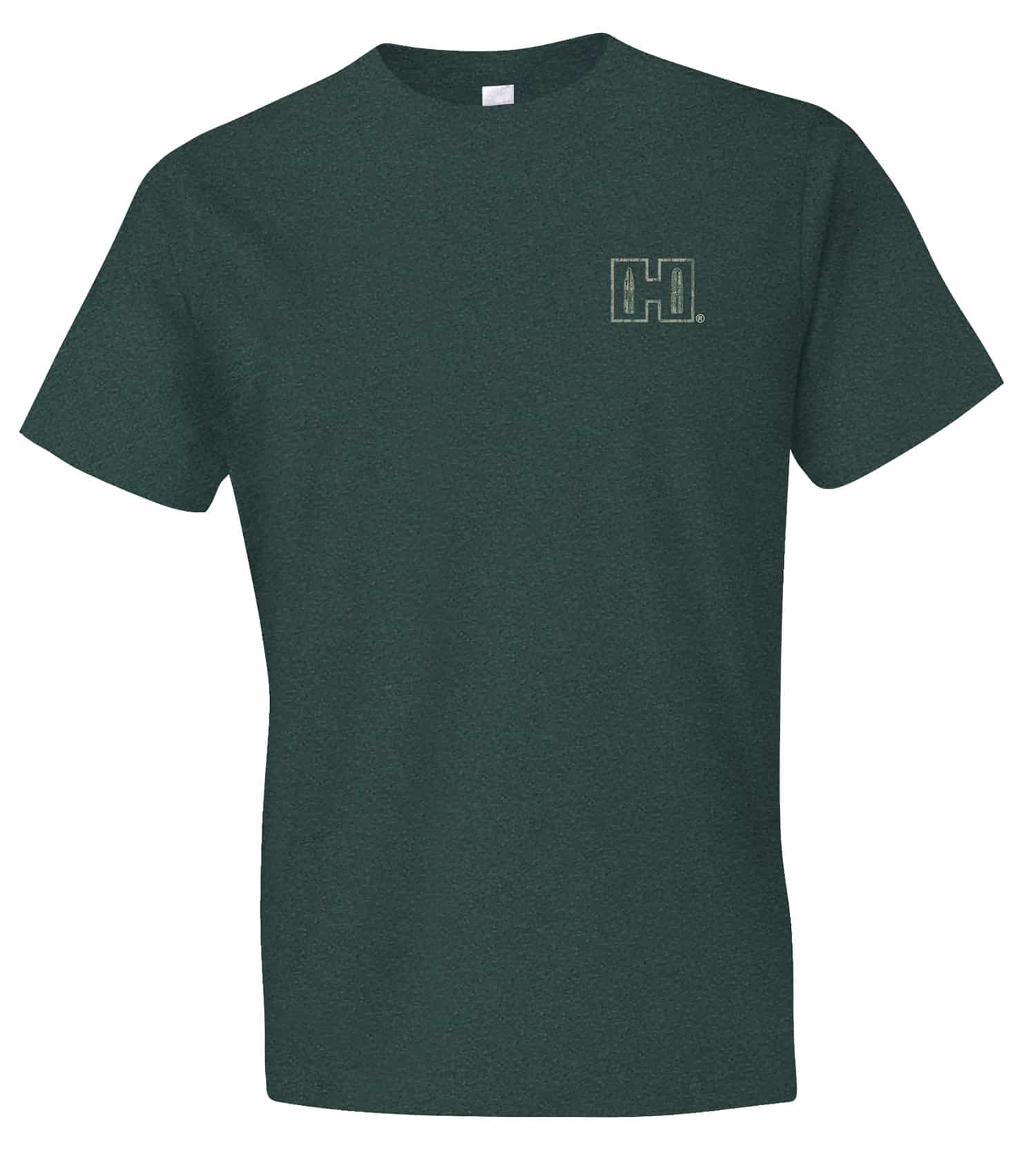 Hornady Double Rocker -t-shirt is semi fitted made of 25% Cotton/50% Polyester/25% Rayon Blend. Big Back Print and Left Chest Front Print.