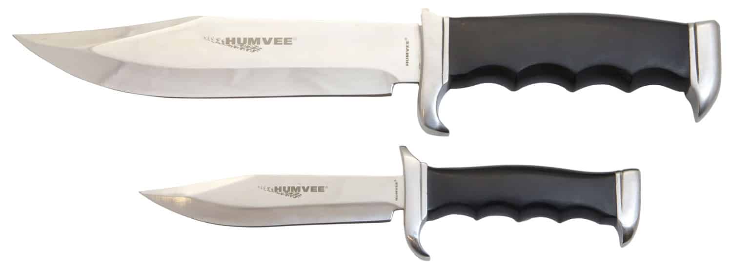 The HUMVEE Bowie Knife Combo Set comes with two knives- a large and a small mirror polished, stainless steel with black Pakawood handles. Includes nylon sheath.