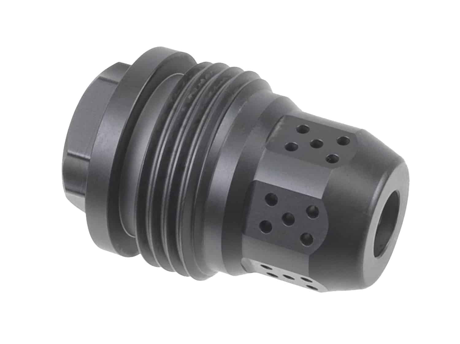A compact, lightweight muzzle device, the JK HD Bald Eagle Compensator reduces recoil and provides a QD mounting point for your JK Quick Attach Taper Mount-equipped suppressor. *Recommended torque spec 35ft/lbs
