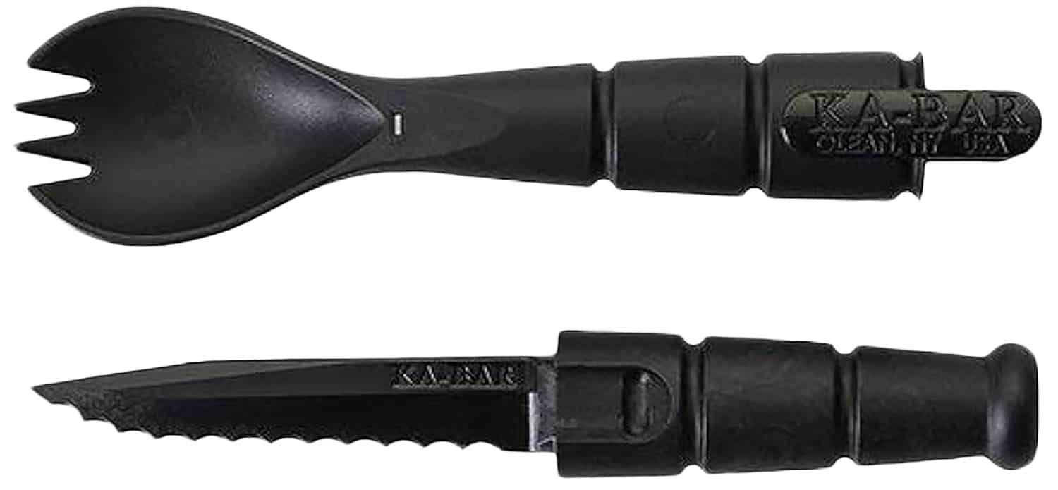 The KA-BAR Spork is equipped with a fork/spoon combo and has a 2.5″ plastic serrated knife in the handle. The knife is accessed by pulling the spork in opposite directions from each extreme end. The Spork is 6.87″ overall and has a blade length of 2.5″. **Hint–avoid gripping the flat panel area in the middle of the Spork, this is actually part of its lock. The tighter you hold here, the more difficult it will be for you to pull out the knife.