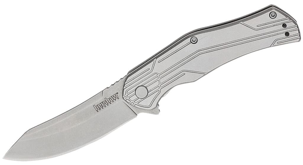 Kershaw 1380X Husker EDC 3″ Folding Trailing Point Plain Bead Blasted 8Cr13MoV SS Blade, Stonewashed Stainless Steel Handle, Clamshell Packaging