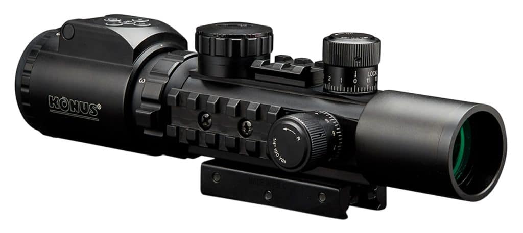 The KonusPro AS-34 electronic tactical scope has quick target acquiring properties, enhancing speed and accuracy at the range or in close quarter situations. The 34mm tube withstands extreme conditions and the integrated tri-rail system accepts all of your accessories. Features an wide angle, engraved dual illuminated red/green Mil-Dot reticle, illuminated level bubble, dual Illuminator switch with 5 brightness settings; reversible base will fit Weaver/Picatinny and .22 rails; wide angle; locking tactical turrets and base is reversible and will fit both the Weaver/Picatinny and .22 rails.