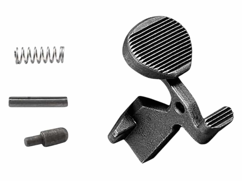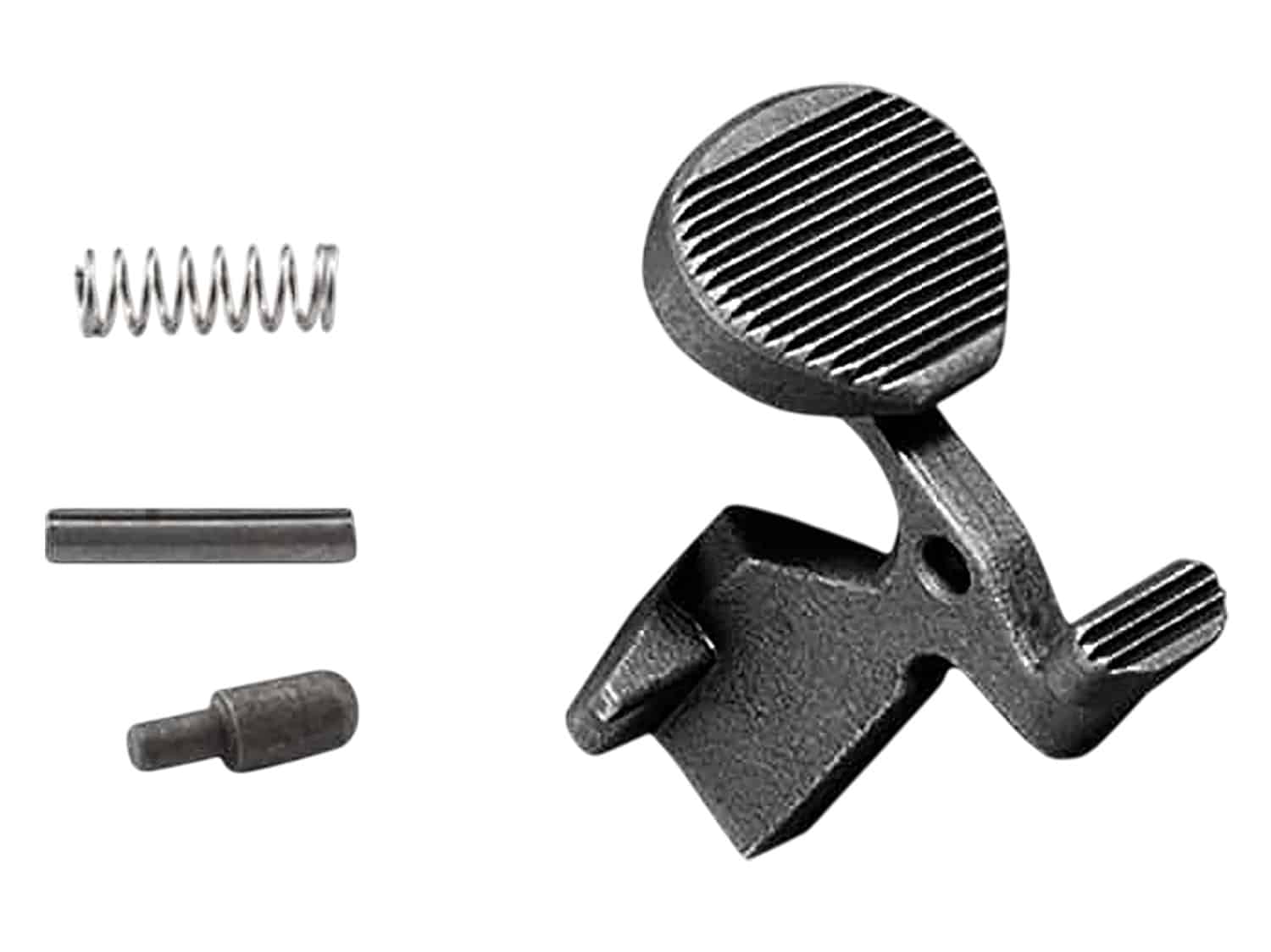 The Paddle allows easy and rapid bolt manipulation. The large paddle facilitates positive bolt release and locking. Perfect for use in competition where high-speed manipulation counts, as well as hunting, law enforcement and military use when wearing gloves in tactical or cold weather situations. Includes: Bolt Catch Spring (1). Bolt Catch Buffer (Plunger) (1). The Paddle Oversize Bolt Catch (1). Bolt Catch Roll Pin (1).