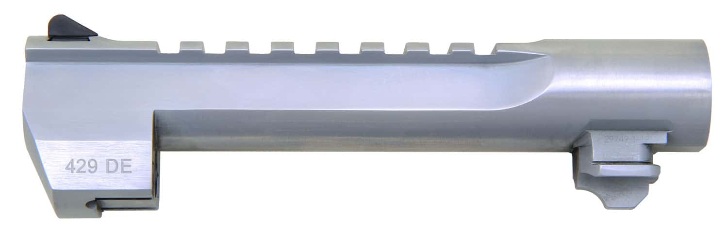 This replacement barrel is constructed of stainless steel with an integrated Picatinny rail and fixed front sight. It is compatible with the Desert Eagle 429DE. This model has a brushed chrome finish.