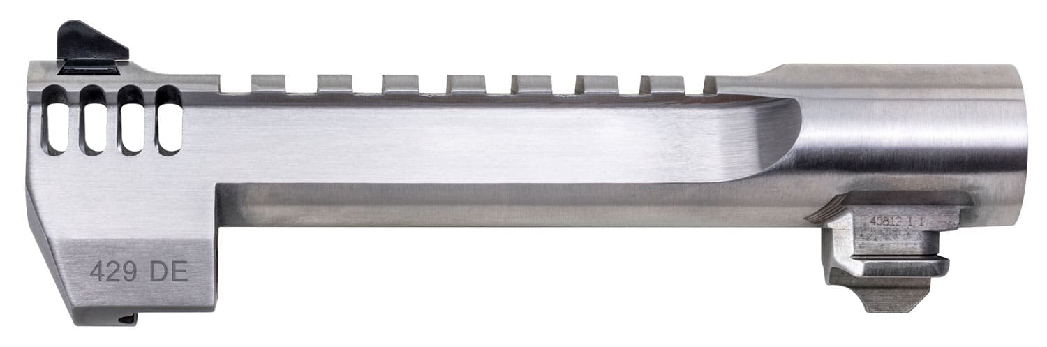 This replacement barrel is constructed of stainless steel with an integrated Picatinny rail and fixed front sight. It is compatible with the Desert Eagle 429DE. This model has a stainless steel finish and integrated muzzle break.