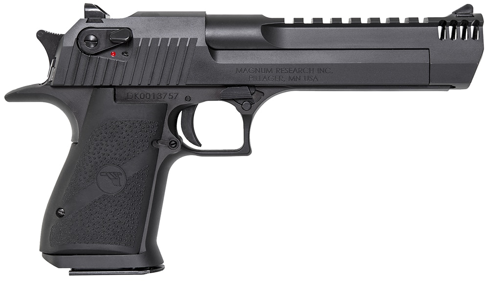The Mark XIX Desert Eagle is a gas-operated, semi-automatic pistol with a trigger reach of 2.75″ and a sight radius of 8.5″. The construction of the Mark XIX Desert Eagle utilizes the latest CNC machine technology providing exacting specifications with tight tolerances creating a work of art in a precision firearm. The grip is anatomically formed and provides an ideal hand seating angle for two-handed shooting allowing for comfortable, rapid and accurate firing. A full picatinny style accessory rail on the barrel from the end of the chamber to right behind the front sight and standard ambidextrous safeties.