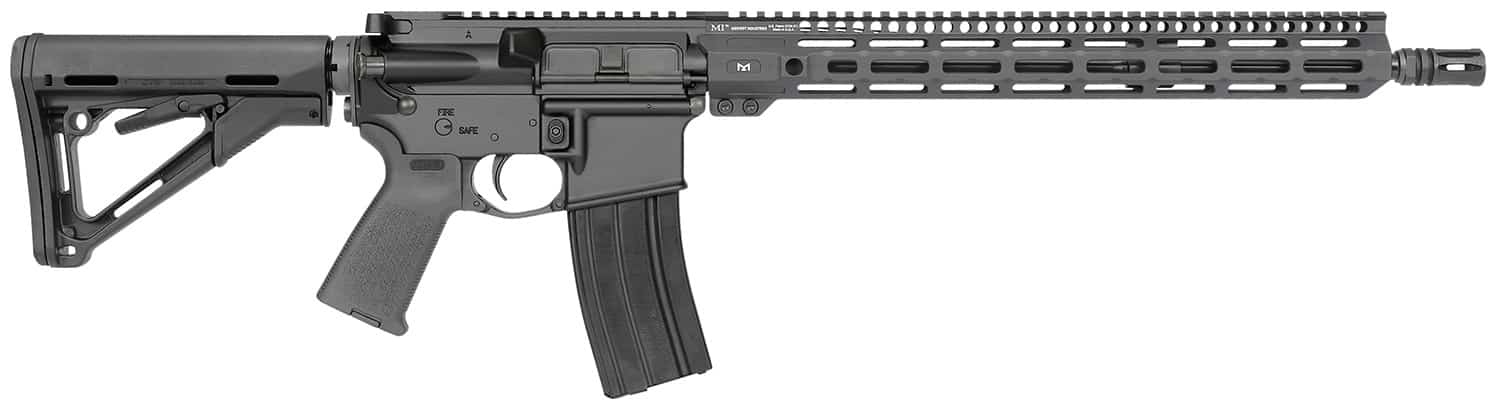 Forged from 7075 T6 aluminum, Precisely machined to M16/M4 specs, M4 feed ramps, Hard-coat anodized mil 8625 type 3 class 2 finish, .250 take down pins, MI M16 bolt carrier group, MI-CRM15″ Combat series handguard, M-LOK(TM) compatible, Laser engraved T-marks, Lightweight Melonite barrel, 16 inch, 1/8 twist, .223 Wylde chamber, Mid-Length gas system, .625 diameter barrel, A2 flash hider, Works with standard AR15 components and magazines, Receiver rear takedown pin detent hole threaded for a 4-40 set screw, Mil Spec diameter buffer tube, Magpul(R) CTR(R) buttstock, Magpul(R) MOE(R) grip, Heavy Duty Quick Detach End Plate MI-HDEP