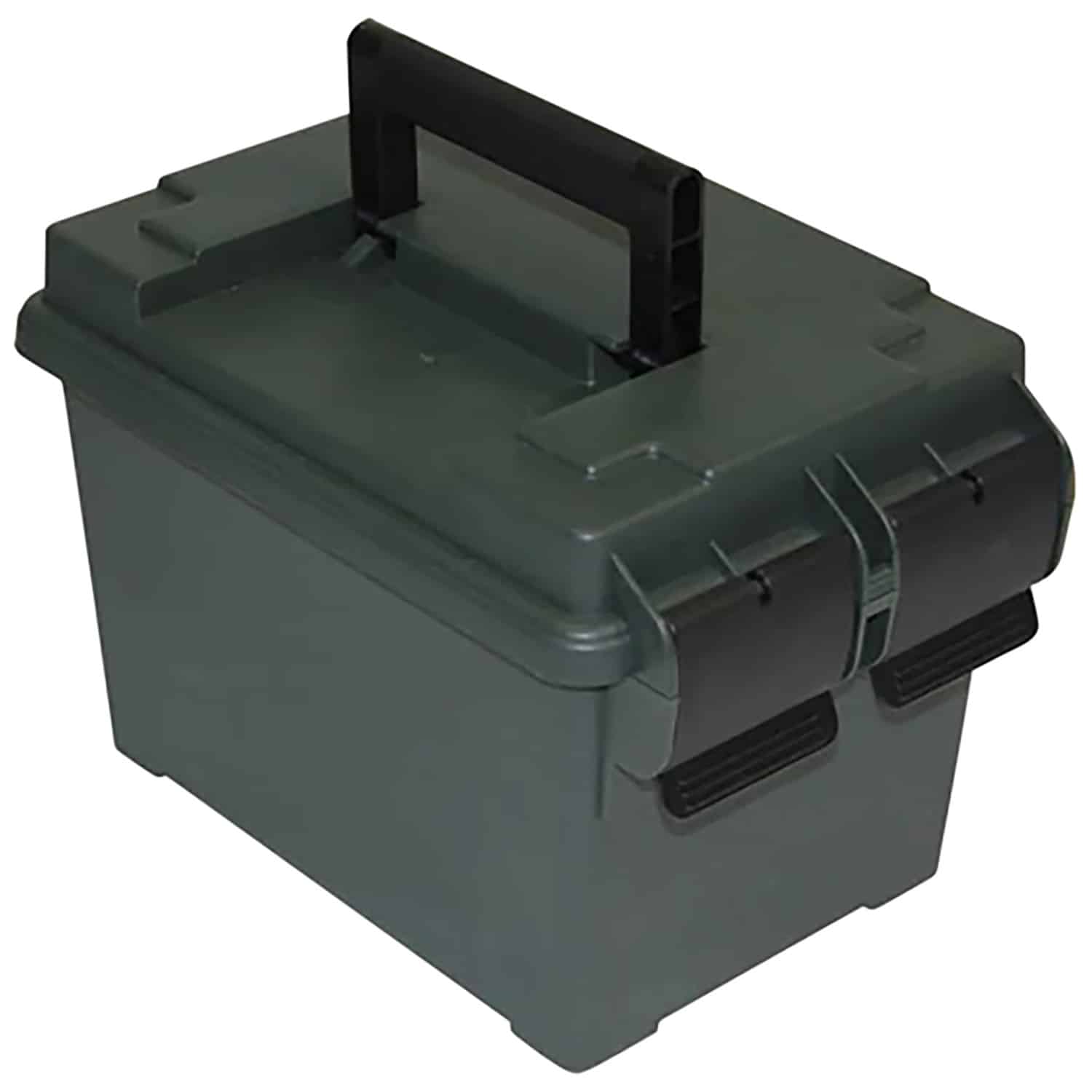 MTM’s 45 Caliber Ammo Can is molded out of rugged polypropylene plastic, and this comfortably handled ammo can will hold up to some pretty harsh treatment. It is lighter in weight than a military surplus can. The 45 Caliber Ammo Can is designed to hold a 500 round case of 45 ACP or 4 boxes of 3 12 gauge shot shells and shooting glasses. Utilizing MTM’s tongue and groove O-Ring seal system for a water-resistant seal. A heavy-duty dual latching system makes for a better seal and less likely to open accidentally. Padlock tabs along with molded-in stacking ridges, make these solid containers the perfect solution to so many storage needs.