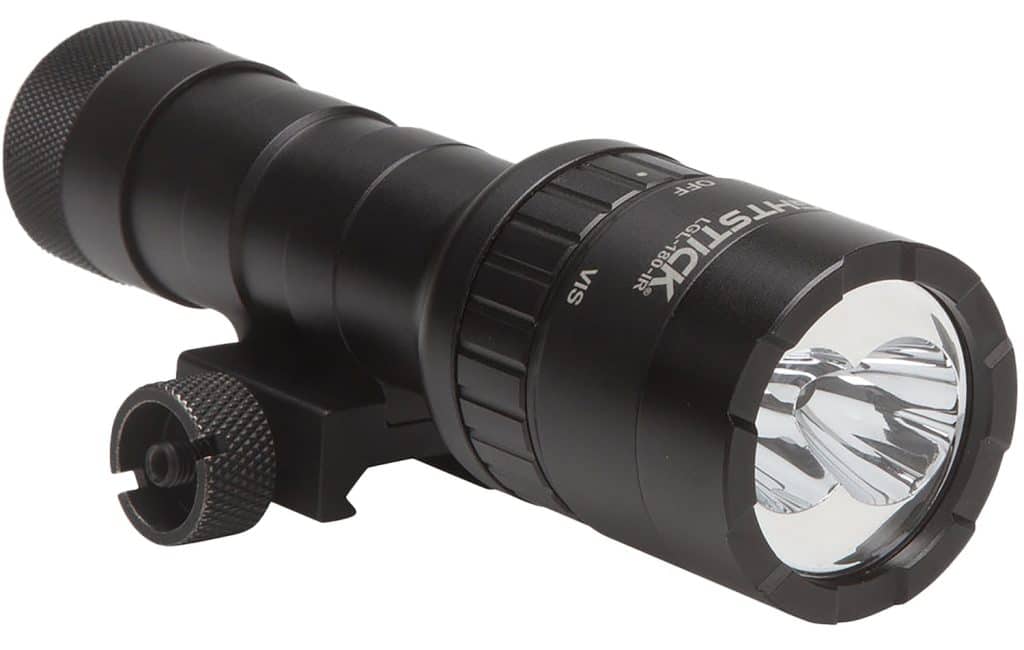 The LGL-180-IR long gun light with IR illuminator is a dual-wavelength weapon lighting system for your rifle, carbine, or shotgun. A hybrid dual reflector with two dedicated LEDs (IR and VIS) means each beam is optimally focused for ultra-high intensity and maximum distance. The 180-IR projects 1100 lumens of visible white light out to 229 meters for 2 hours, while a separate 1400mw 940nm IR illuminator beam provides a similar range and runtime during night vision use. A rotating collar on the bezel allows the user to select visible (VIS) or infrared (IR) modes, or OFF. The light comes installed with a standard tail cap switch and reversible thumbscrew Picatinny mount. It can alternatively be mounted with the included offset Picatinny mount, providing flexible options to clear front sights and other mounted equipment while allowing easy support hand activation. Both the tail cap switch as well as the included 6″ remote pressure pad/switch feature momentary or constant-on modes. The kit also includes an RPS Picatinny rail mount and Nightstick-exclusive wire management rail clamp to prevent cable snags. The 180-IR weapon light kit includes (2) CR123 batteries. As a bonus, the multi-fuel 180-IR also runs on a single 18650 lithium-ion battery. A pair of 4700-BATT lithium-ion batteries and a single-cell charger are sold separately.