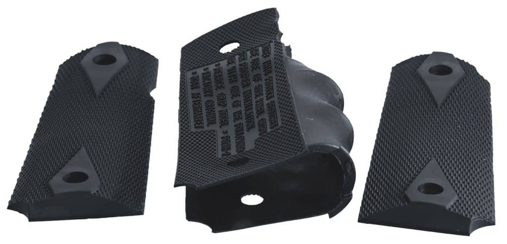 The Modular System is made up of 1 Finger Groove Insert (PG1911-1) and 1 Side Panel Grip (PG1911-2). This all-rubber grip system provides a secure and more repeatable grip on the Government Model 1911. The ultra slim black rubber side panel has a slight palm swell giving the user a more positive hold while reducing the overall width. It has the classic double diamond checkering pattern of the 1911 Government model. The Finger Groove Insert fits under any GM 1911 side panel grip adding rubber front finger grooves for comfort and better handling. The side portion of the grip is only 1mm thick, so the overall width is only minimally affected.