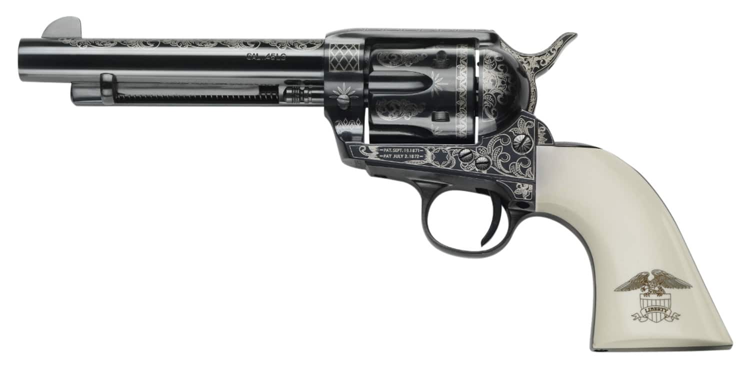 Pietta GW45LLE434NMUI 1873 GW2 Liberty 45 Colt (LC) 6 Shot, 4.75″ Blued Engraved Steel Barrel, Cylinder, Frame & Hammer, Ultra Ivory Grip w/Engraved Liberty Eagle