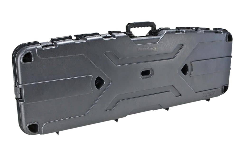 The double gun case has patented pillarlock system to protect firearms. Holds two scoped rifles with large objectives lenses. Six heavy duty latches. Overmolded flexible handle. Is lockable and airline approved. Poly tie-down straps hold firearms in place.