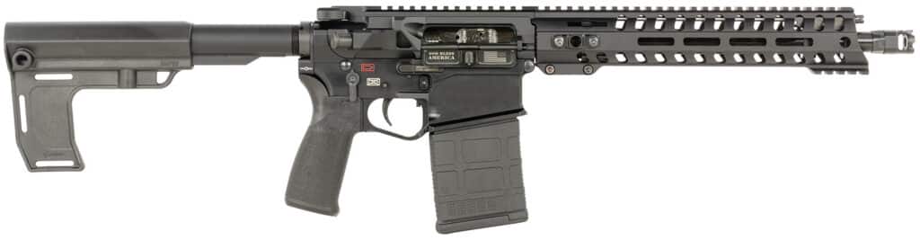 The Revolution DI SBR provides the same technology, same durability, same features and same AR-15 size, but in a smaller direct impingement system featuring our 9-position adjustable Dictator gas block and Renegade rail. The Revolution DI SBR weighs 6.5 lbs. with a 12.50″ barrel, making it ideal for just about any situation you put it in. The Revolution DI SBR Features 4150 CrMoV Steel threaded barrel; 1-10 Twist; 5R Right Hand Lands & Grooves; Mid-Length gas system with 9 position Dictator Adjustable Gas Block; 11″ aluminum Renegade Rail; single stage curved drop in trigger; aluminum billet machined upper and aluminum billet machined Gen 4 fully ambidextrous CMR lower receivers; integrated oversized trigger guard; KeyLock BCG with a Roller Cam pin; ambidextrous safety; QD Mount receiver extension end plate; 6 Position Anti-Tilt Buffer Tube; ambidextrous Tomahawk charging handle; MFT Minimalist stock and an MFT ENGAGE V2 grip. Includes one 20rd Magpul PMAG.