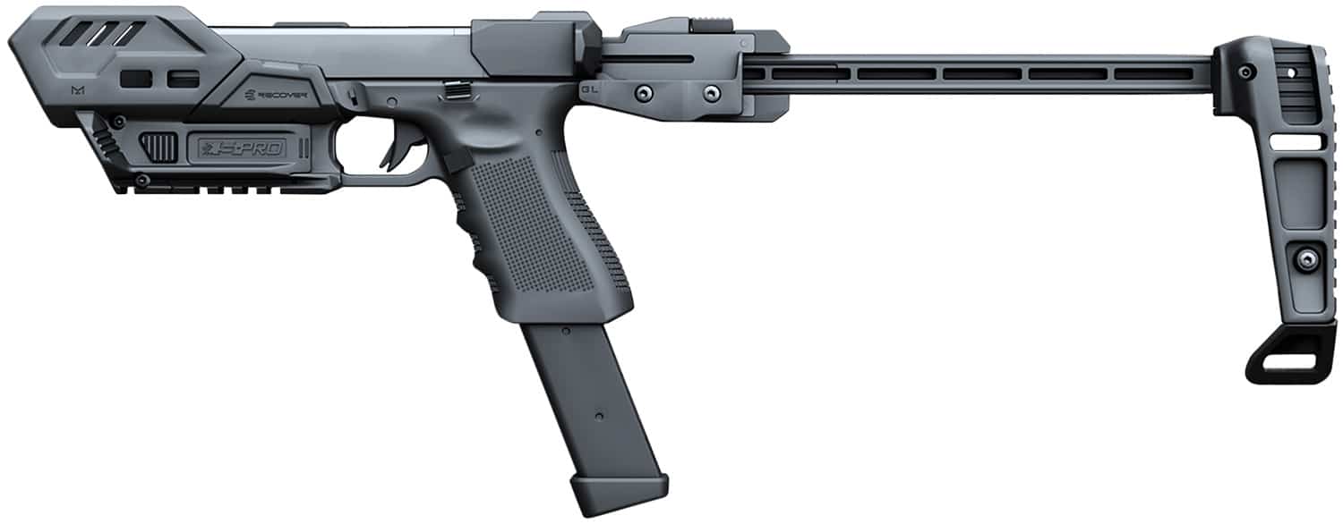 S-PRO is next-level pistol conversion kit, featuring a spring-loaded stabilizer (which can be converted to a buttstock by removing the included brace attachment), MLOK mounting options, and broad compatibility.