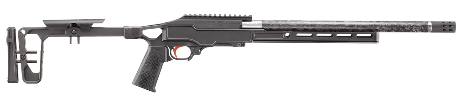 The 10/22 Competition features a grey birch chassis with a modular 10″ forend w/M-LOL and Arca-Swiss compatibility and ambidextrous QD points; stock is adjustable for length of pull and cheek height and folds for easy storage and transport; dual bedding system incorporates a second bedding lug, ensuring the receiver is securely bedded to the stock; cold hammer-forged barrel tensioned in carbon fiber sleeve features a 1/2″-28 threaded muzzle and is fitted with a thread cap which can be removed to allow for the use of muzzle accessories; cross-bolt manual safety; integral, optics-ready 30 MOA picatinny rail; the receiver and stock combine to create classic lines for attractive styling. Includes hard case; Ruger custom shop certificate of authenticity, challenge coin, cleaning cloth and decal.
