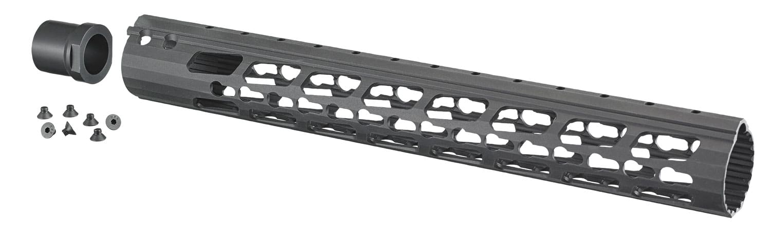 This Ruger-branded handguard provides improved clearance for larger long range scopes. The wider keymod flat at the 6:00 position provides a stable foundation for mounting bipods. It is manufactured from 6061-T6 aluminum and finished with a Type III Mil-Spec hard coat anodizing for light weight and durability. Included is a kit that comes with handguard and mounting hardware.