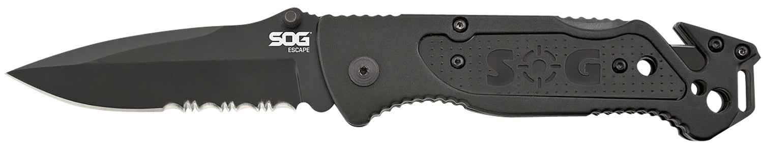 S.O.G SOGFF25CP Escape 3.40″ Folding Clip Point Part Serrated Black Hardcased 9Cr18MoV SS Blade Black Anodized Aluminum Handle Includes Belt Clip