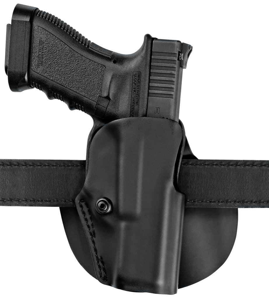 The Safariland Model 5198 holster is lightweight, with low-cut sides allowing for an easy draw, and an open-top designed for defensive pistol competition. The holster is well suited for concealed carry due to its compact size. A trigger guard detent and adjustable tension device secures the gun in the holster during rigorous activity for reliable carry retention. Durable thermoformed SafariLaminate construction makes this holster tough enough for constant wear, and the STX finish keeps it looking good through years of use. The 5198 comes with both injection-molded paddle and belt loop, so you can attach and adjust carry for comfort and to match your needs. This model has a black finish and is compatible with Sig P320 9/40.