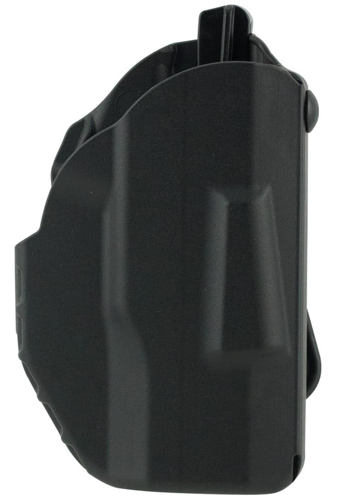 The Safariland Model 7378 7TS ALS Concealment Holster is constructed of SafariSeven, a proprietary nylon blend that is completely non-abrasive to a firearm’s finish and is a paddle and belt loop combo holster. Features an open-top design without SLS for quick retrieval of weapon, ALS (Automatic Locking System) secures weapon once holstered; simple straight up draw once release is deactivated and raised standoff surfaces in holster’s interior creates air space around the weapon allowing dirt and moisture to quickly clear any contact with the firearm. The 7378 7TS has a very high heat and low cold tolerance; structurally sound from 300 degrees Fahrenheit to -50 degrees Fahrenheit. Includes injection-molded belt loop; is user adjustable for cant and can be worn cross draw.