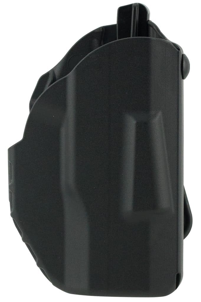 The Safariland Model 7378 7TS ALS Concealment Holster is constructed of SafariSeven, a proprietary nylon blend that is completely non-abrasive to a firearm’s finish and is a paddle and belt loop combo holster. Features an open-top design without SLS for quick retrieval of weapon, ALS (Automatic Locking System) secures weapon once holstered; simple straight up draw once release is deactivated and raised standoff surfaces in holster’s interior creates air space around the weapon allowing dirt and moisture to quickly clear any contact with the firearm. The 7378 7TS has a very high heat and low cold tolerance; structurally sound from 300 degrees Fahrenheit to -50 degrees Fahrenheit. Includes injection-molded belt loop; is user adjustable for cant and can be worn crossdraw.