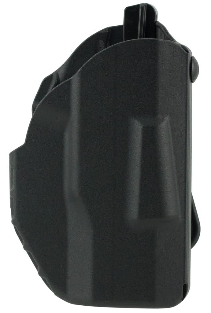 The Safariland Model 7378 7TS ALS Concealment Holster is constructed of SafariSeven, a proprietary nylon blend that is completely non-abrasive to a firearm’s finish. and is a paddle and belt loop combo holster. Features an open-top design without SLS for quick retrieval of weapon, ALS (Automatic Locking System) secures weapon once holstered; simple straight up draw once release is deactivated and raised standoff surfaces in holster’s interior creates air space around the weapon allowing dirt and moisture to quickly clear any contact with the firearm. The 7378 7TS has a very high heat and low cold tolerance; structurally sound from 300 degrees Fahrenheit to -50 degrees Fahrenheit. Includes injection-molded belt loop; is user adjustable for cant and can be worn crossdraw.
