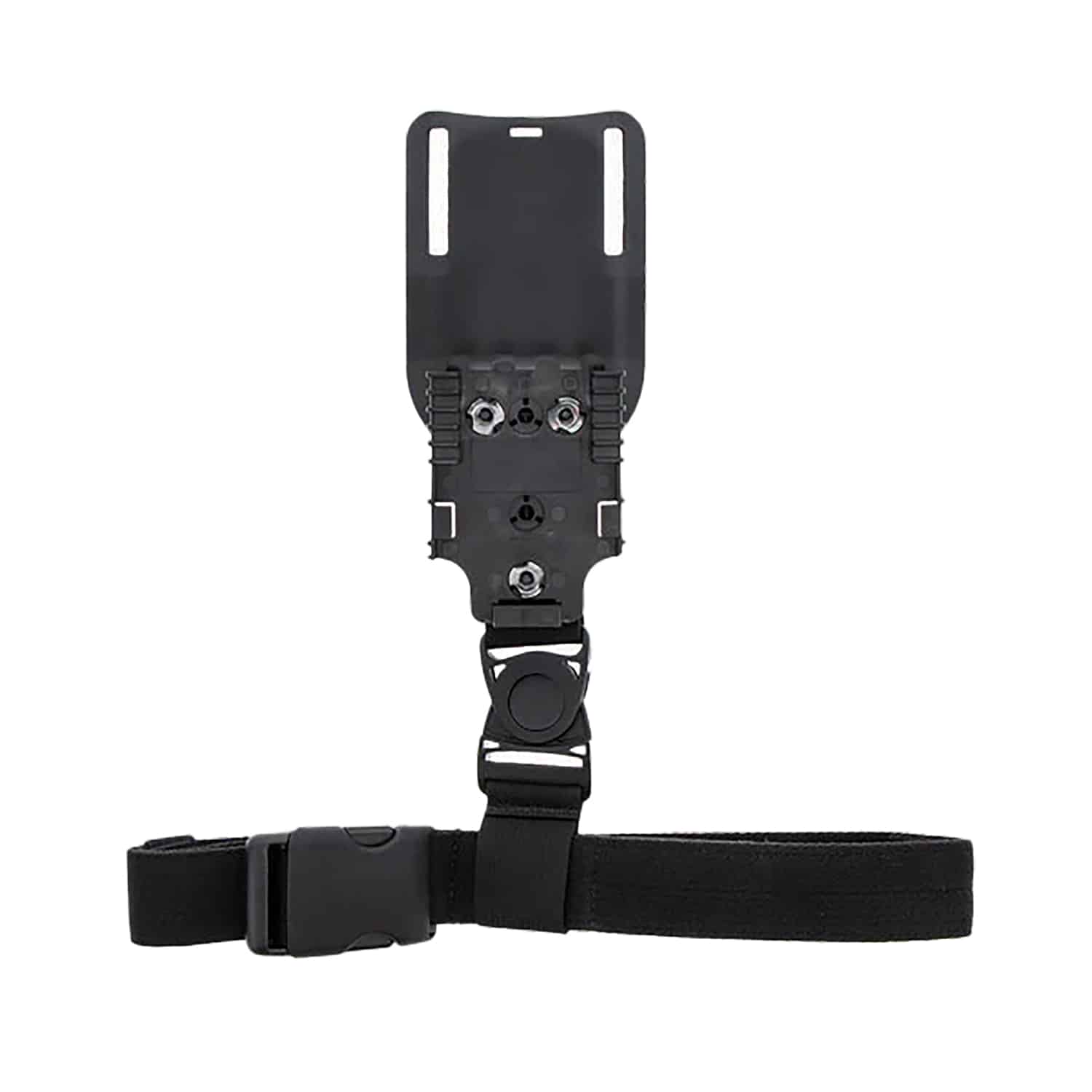 The RGR-UBL is a low-ride belt loop with the QLS 22 Receiver Plate and single elastic strap attached. It will not pinch or add pressure to hip bone and locks onto the belt with a slot design. The QLS 22 Receiver Plate is designed to attach to the QLS 19 Locking Fork and allows to rearrange gear quickly and easily without the use of tools. The elastic leg strap includes two silicon strips for non-slip traction.