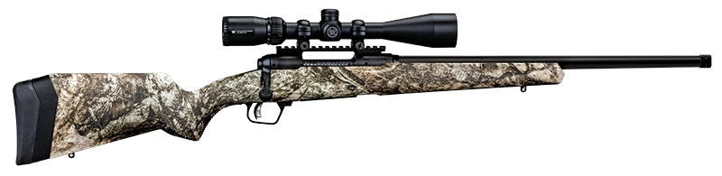 Carnivores are crushed. Savage’s Apex Predator XP pairs a Model 110 rifle with a 4-12x44mm Vortex Crossfire II scope that comes mounted, bore-sighted and ready to hunt. The platform provides accuracy and adjustability like no other package predator rifle thanks to the Savage AccuTrigger, thread-in headspacing, floating bolt head and precision button-rifled heavy barrel. Plus, the length-of-pull of its synthetic Mossy Oak Terra camo stock can be easily adjusted to fit any hunter for better comfort and consistency. The Crossfire II’s Dead-Hold BDC reticle makes it easy to place accurate shots at extended range, and the optic is securely mounted to a one-piece EGW 0 MOA rail. The Predator XP comes with a heavy threaded barrel and thread protector.