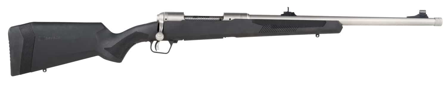 Savage’s 110 Brush Hunter model stops the biggest game in its tracks. It features a synthetic stock with an adjustable length of pull, stainless steel receiver with iron sights, Savage’s AccuTrigger for flexibility. This 375 Ruger model has a 20″ matte stainless barrel and a black finish stock and forend.
