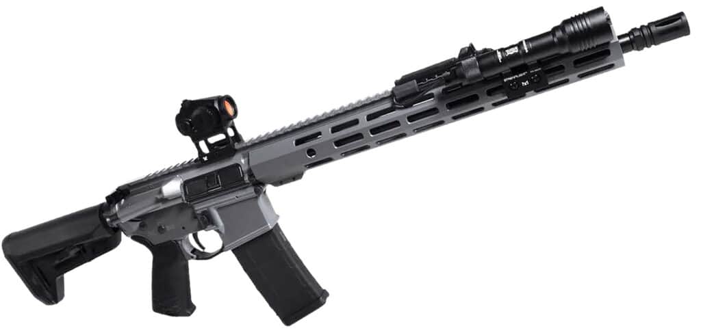 The Grey Night AR where style meets precision. This mil-spec masterpiece boasts a custom Grey Cerakote finish for durability and style, while the Vortex Crossfire Red Dot ensures pinpoint accuracy in low-light conditions. Illuminate your path with the 625 Lumen ProTac RailMount Light w/pressure switch and enjoy enhanced control and handling with a matching Magpul stock and grip. Each rifle includes a double rifle carry case and an official Shark Coast patch.