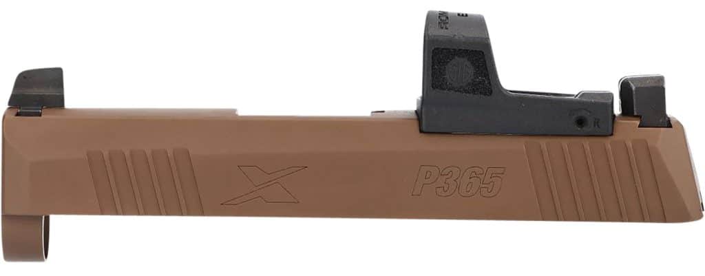 This factory replacement, P365X stainless steel slide assembly fits P365X grip modules. It accommodates our P365X 3.1″ barrel. This slide comes with Sig’s XRAY3 day/night sights and a removable sight plate cover ready to accept a micro-optic such as the ROMEOZero red dot sight. Barrel Compatibility: 9MM Finish: Coyote Tan Nitron *Does not include recoil spring, guide rod, or barrel. **Please Note** This slide is NOT compatible with the ported barrel.