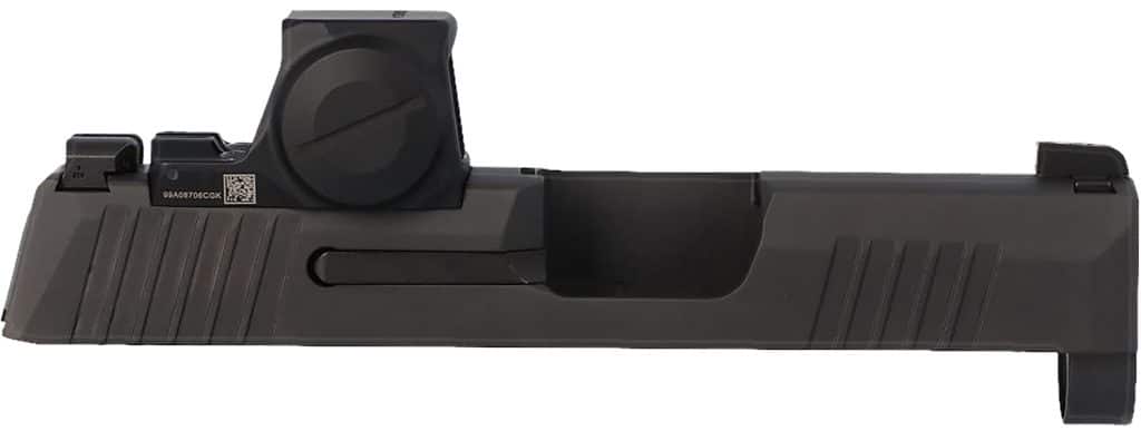Enjoy using a slide-mounted reflex sight without needing suppressor height iron sights. The factory-installed ROMEO-X COMPACT optic sits incredibly low to the slide to enjoy co-witness with the included standard height iron sights, giving you a consistent, familiar sight picture. Factory replacement 3.1″ 9MM slide for the P365X. Compatible with all P365 9mm models and configurations with the following accompanying items: P365/P365X 3.1″ barrel, and recoil assembly.