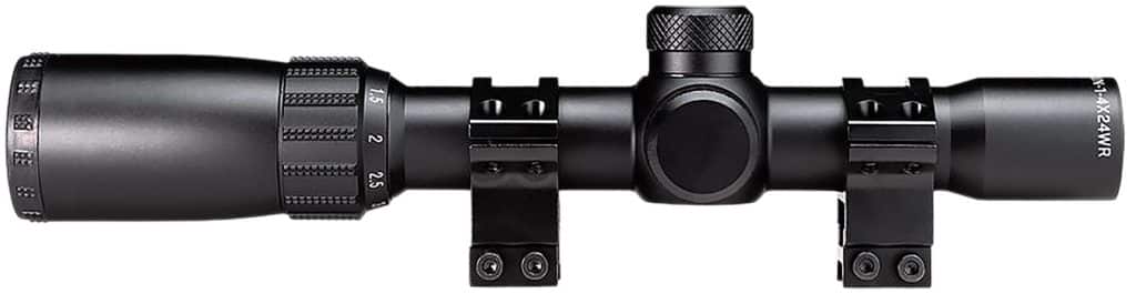 The Sig Air T4 rifle scope features a low profile, tactical design with a 1″ diameter tube; 1x to 4x adjustable magnification with a quick focus ring; 24mm, Multi-Coated objective lens; Mil-Dot reticle; Windage and Elevation adjustable with toolless turrets. Includes Picatinny scope rings.