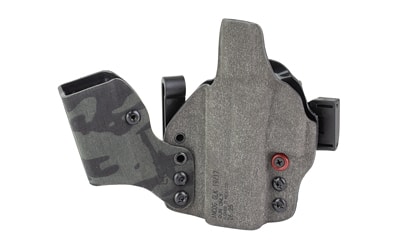 An ergonomic, mission-adjustable, RDS-compatible, multi-positional, deep concealment IWB hybrid thermoplastic holster. Its distinctive features enable concealed carry for a wide range of handgun fits from various carry positions while allowing a full firing grip prior to drawing. The design includes passive retention and adjustable tension, enabling a finely tuned fit and smooth draw. This evolution of the IncogX features a series of clips that provide more adaptability to the user while maintaining the original goals of improved grip, concealment, and function. The clips open outward and slide down with the holster, naturally locking over the belt. An actuated finger tab flexes to open, allowing quick installation or removal from the belt. An improved clip strut design combines functionality with customized concealment shims that can be easily installed or removed without tools. All IncogX models come with clip strut shims in three different concealment sizes: 1/8″, 1/4″, and 3/8″.