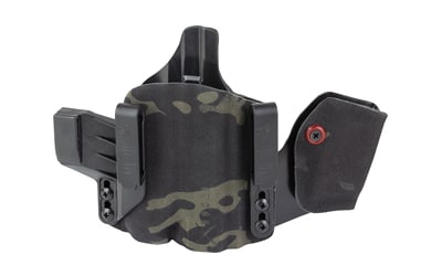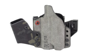 An ergonomic, mission-adjustable, RDS-compatible, multi-positional, deep concealment IWB hybrid thermoplastic holster. Its distinctive features enable concealed carry for a wide range of handgun fits from various carry positions while allowing a full firing grip prior to drawing. The design includes passive retention and adjustable tension, enabling a finely tuned fit and smooth draw. This evolution of the IncogX features a series of clips that provide more adaptability to the user while maintaining the original goals of improved grip, concealment, and function. The clips open outward and slide down with the holster, naturally locking over the belt. An actuated finger tab flexes to open, allowing quick installation or removal from the belt. An improved clip strut design combines functionality with customized concealment shims that can be easily installed or removed without tools. All IncogX models come with clip strut shims in three different concealment sizes: 1/8″, 1/4″, and 3/8″.