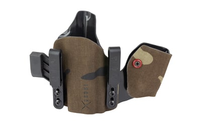 An ergonomic, mission-adjustable, RDS-compatible, multi-positional, deep concealment IWB hybrid thermoplastic holster. Its distinctive features enable concealed carry for a wide range of handgun fits from various carry positions while allowing a full firing grip prior to drawing. The design includes passive retention and adjustable tension, enabling a finely tuned fit and smooth draw. This evolution of the IncogX features a series of clips that provide more adaptability to the user while maintaining the original goals of improved grip, concealment, and function. The clips open outward and slide down with the holster, naturally locking over the belt. An actuated finger tab flexes to open, allowing quick installation or removal from the belt. An improved clip strut design combines functionality with customized concealment shims that can be easily installed or removed without tools. All IncogX models come with clip strut shims in three different concealment sizes: 1/8″, 1/4″, and 3/8″.