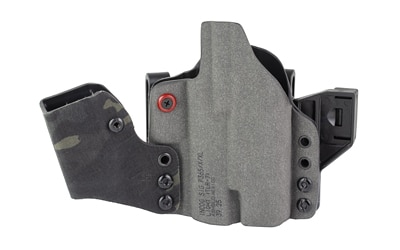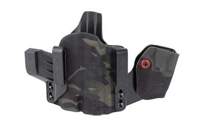 An ergonomic, mission-adjustable, RDS-compatible, multi-positional, deep concealment IWB hybrid thermoplastic holster. Its distinctive features enable concealed carry for a wide range of handgun fits from various carry positions while allowing a full firing grip prior to drawing. The design includes passive retention and adjustable tension, enabling a finely tuned fit and smooth draw. This evolution of the IncogX features a series of clips that provide more adaptability to the user while maintaining the original goals of improved grip, concealment, and function. The clips open outward and slide down with the holster, naturally locking over the belt. An actuated finger tab flexes to open, allowing quick installation or removal from the belt. An improved clip strut design combines functionality with customized concealment shims that can be easily installed or removed without tools. All IncogX models come with clip strut shims in three different concealment sizes: 1/8″, 1/4″, and 3/8″.