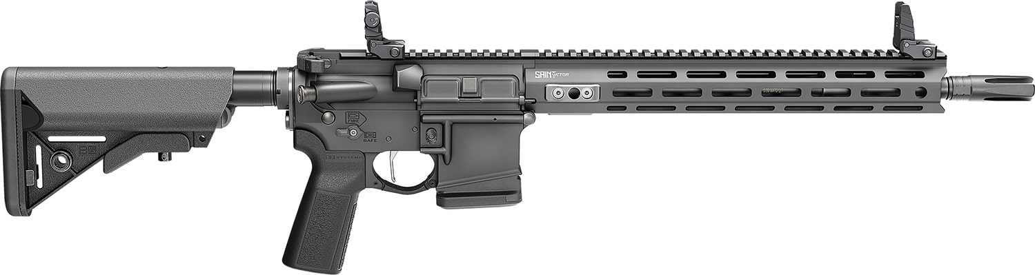The Saint Victor features a free float aluminum handguard w/SA locking tabs and M-LOK; B5 Systems Enhanced SOPMOD stock; Mil-Spec receiver extension; B5 Systems Type 23 P-Grip; Radian Raptor Ambidextrous charging handle; QD receiver end plate; 45-degree ambidextrous safety; B5 systems polymer trigger guard and a pinned & welded 4-Prong flash hider. Includes one 10rd Magpul PMAG Gen M3.