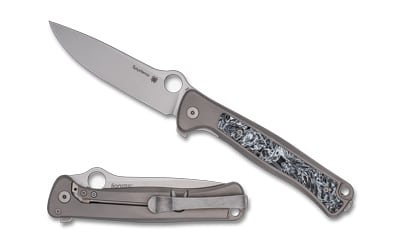 Produced by lionSTEEL exclusively for Spyderco, the Slym elevates Michele Pensato’s popular Skinny design with the user friendliness of our Trademark Round Hole in the blade. This lean folder features a full-flat-ground, drop-point blade crafted from Bohler-Uddeholm’s M390 particle metallurgy stainless steel. In addition to its fully accessible Round Hole, the stonewash- finished blade also includes a removeable flipper tab and rides on ball-bearing washers for an ultra-smooth action. The Slym’s unique handle is precision machined from a single piece of titanium using lionSTEEL’s SOLID technology. It also boasts a durable gray physical vapor deposition (PVD) coating and a black-and-white Dark Matter Polar Fat Carbon Fiber inlay on the obverse side. The handle’s reverse side is home to a sturdy Reeve Integral Lock (R.I.L.) mechanism that includes a long-wearing hardened steel interface. To keep the knife poised for instant access, the handle also features both a generously sized lanyard hole and a butt-mounted, deep-pocket clip that is reversible for left or right-side carry.