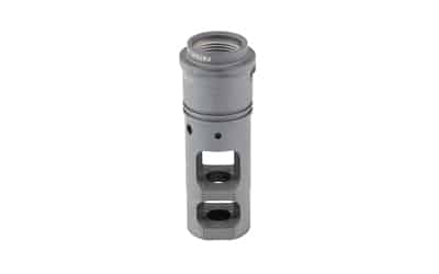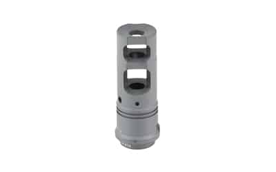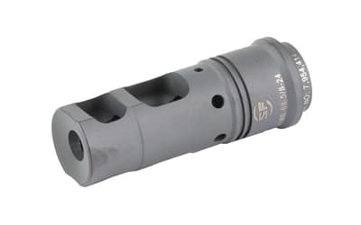 Reign Over Recoil. SureFire SFMB muzzle brake suppressor adapters greatly reduce both recoil impulse and muzzle rise so that your weapon tracks straight back, keeping you on target for faster shot-to-shot recovery. Their proprietary Impulse Diffusion design minimizes side blast and rear-directed concussion effects. Precision machined from U.S. mill-certified heat-treated stainless steel bar stock and DLC-coated for extreme durability, they are available for a variety of weapon calibers and muzzle thread specs, and every SFMB serves as a rock-solid mounting adapter for SureFire’s combat-proven SOCOM Series Fast-Attach suppressors.