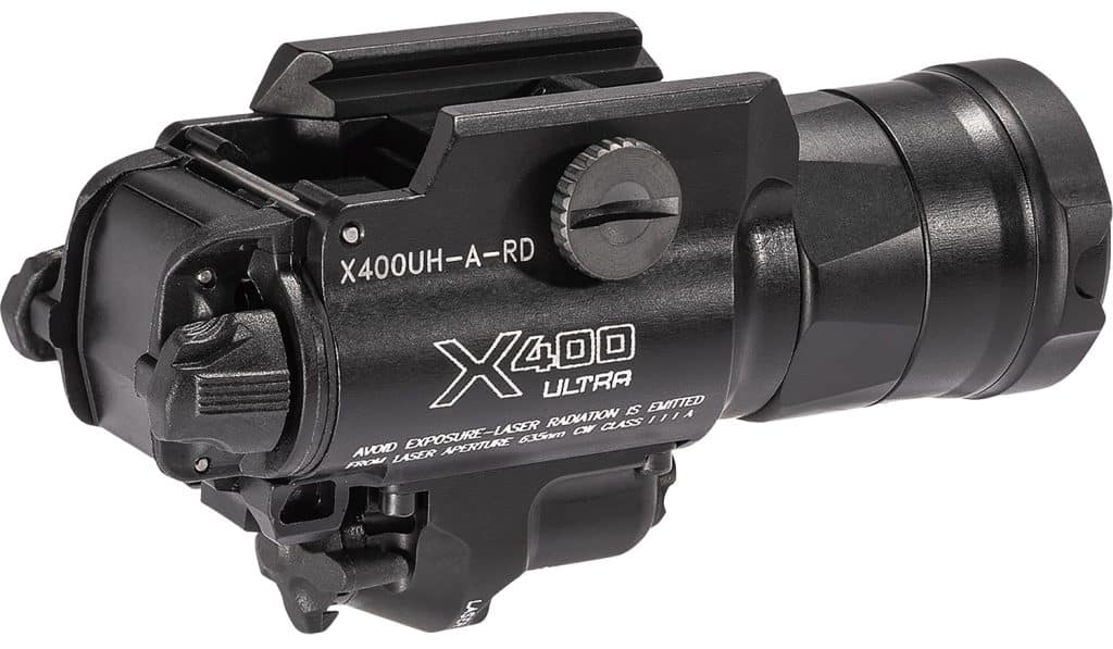 Draw With Maximum Efficiency. If your pistol is equipped with a SureFire X400UH-A-RD, you have a clear advantage. The X400UH-A-RD is engineered to fit virtually any rail-equipped pistol and interface with SureFires revolutionary MasterFire Rapid Deploy Holster. It locks securely into the MasterFire, securing the weapon at an advantageous angle for quick deployment and can be set to automatically activate the light and the laser when the weapon is drawn, saving critical time in a crisis situation. Its recoil-proof LED and TIR lens focus 1,000 lumens of light into a smooth, far-reaching hybrid beam with a large central spot and ample spill for situational awareness. Available in traditional red (635 nanometers) or high-vis green (515 nanometers), its 5-milliwatt laser is highly visible to the human eye. With a Mil-Spec hard-anodized aluminum body that’s light, strong and weatherproof, the X400UH-A-RD will get the point across to any opponent.