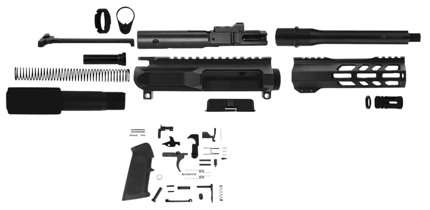 Tacfire’s AR Pistol Build Kit Includes: (1) 9MM 7.5″ Barrel USA Made, (1) 9MM Bolt Carrier Group, (1) Mil-Spec Upper Receiver USA Made, (1) Slim Free Float MLOK Hand Guard 7″, (1) Complete Lower Parts Kit USA Made, (1) Standard Receiver End Plate, (1) Mil-Spec/Commercial Castle Nut/Steel, (1) Mil-Spec Pistol Buffer Tube/Alum. w/Foam Cover, (1) Heavy Buffer, (1) Buffer Tube Spring, (1) Mil-Spec Charging Handle, (1) Dust Cover, (1) Forward Assist, (1) 1/2″x36 Thread Flash Forwarder